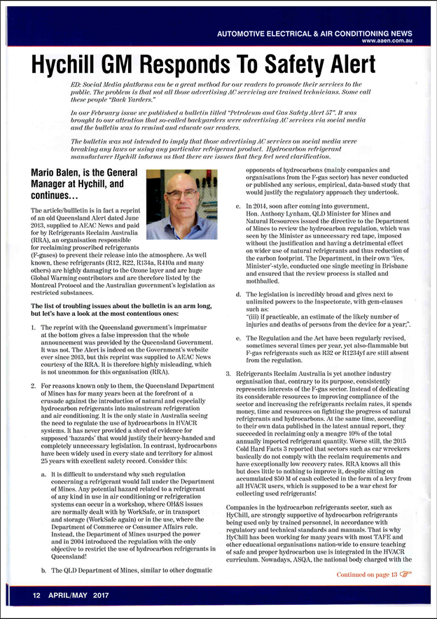 エアコンに使用される冷媒ガスは、化学物質であるフッ素の利用が始まりフロンガスが開発されるとその利便性と冷媒性能から多くのフロンガス冷媒が開発され使用されてきました。ところがフロンガスが地球温暖化に大きな影響を及ぼしていることが判明し、徐々にフロンガス冷媒の使用が見直され始めています。 我々は、フロンガス冷媒が普及する以前から使用されていた自然冷媒ガスの一つである炭化水素冷媒を、フロンガス冷媒機器にそのまま使えるように製造しているHyChill AUS社の製品ハイチルガスを使用することで、脱フロンガス、地球温暖化対策を目指しています。